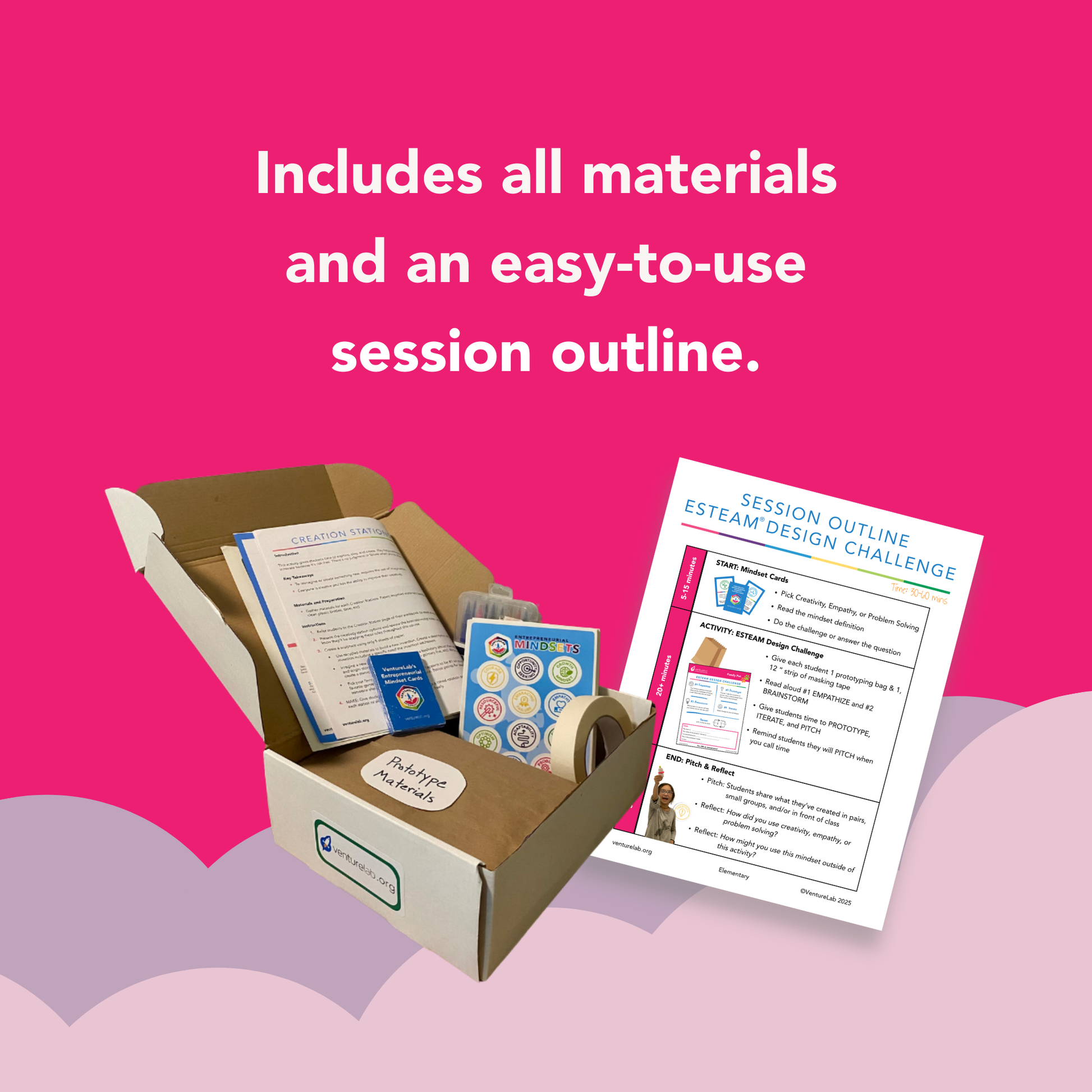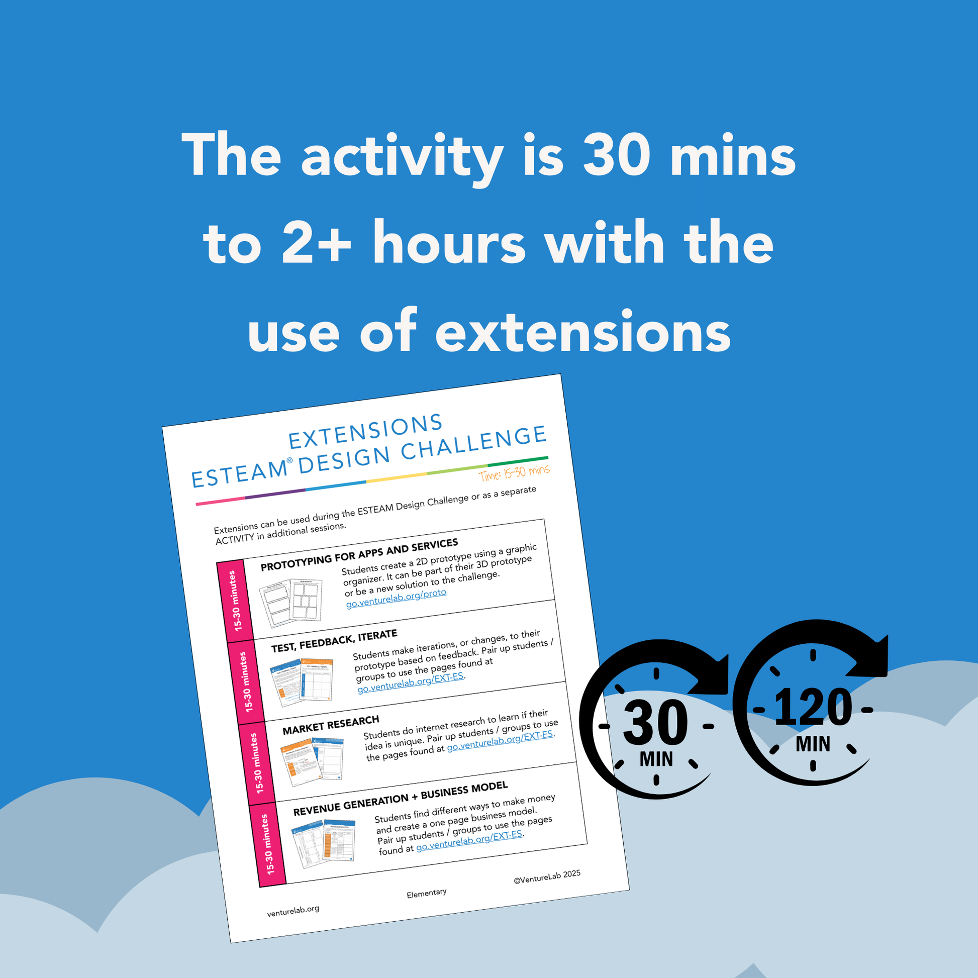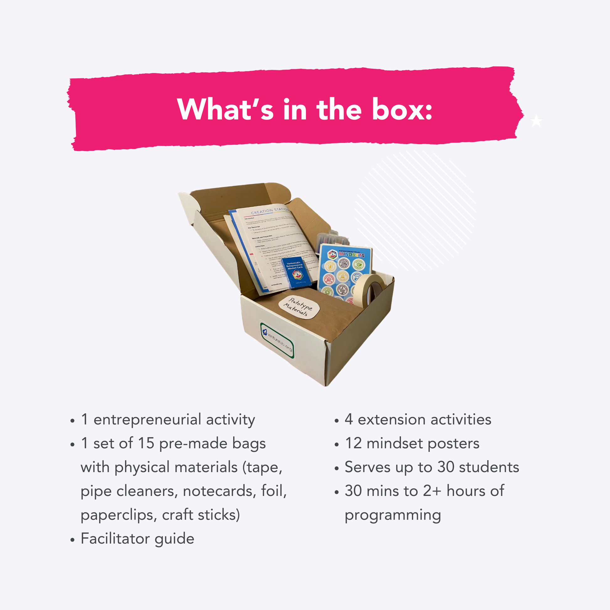 Whether you run the challenge in a single session or extend it to include additional skills such as market research and business model, STEAM (Science, Technology, Engineering, Art & Math) Learning is brought to life through an Entrepreneurial lens with this challenge. Your students will have FUN while developing valuable mindsets & skills that will help them in their personal and academic lives and support future workforce development.